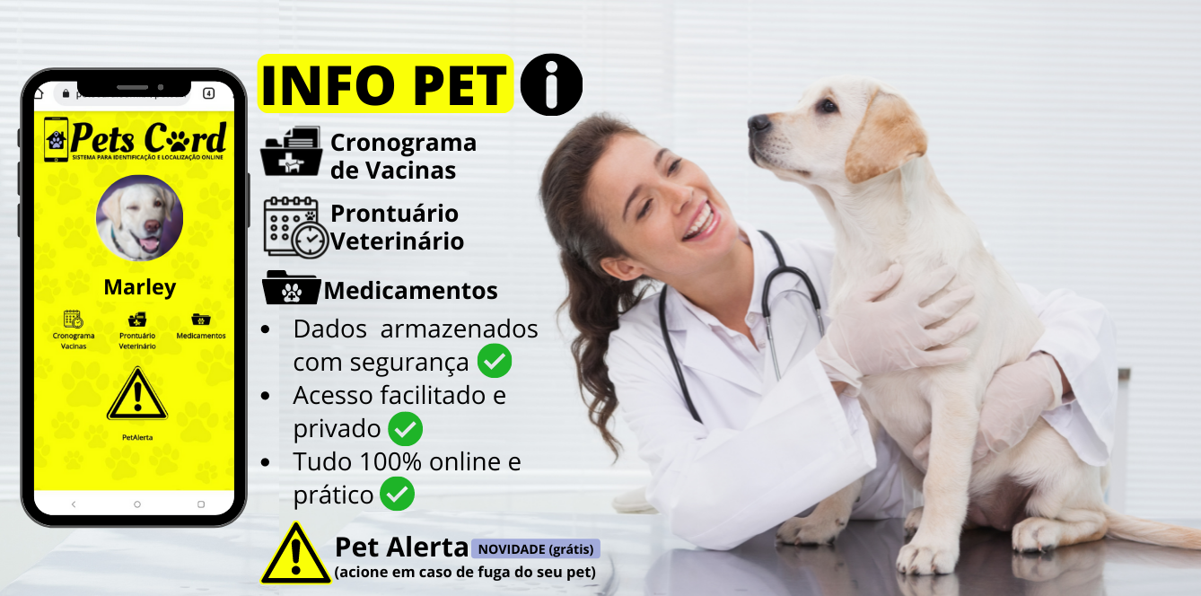 Os dados veterinários do pet podem ser acessadas somente pelo tutor, basta apontar a câmera do celular para o QR Code do pingente Pets Card e as informações do pet serão apresentados como: Cronograma de Vacinas, Medicamentos e Prontuário Veterinário.